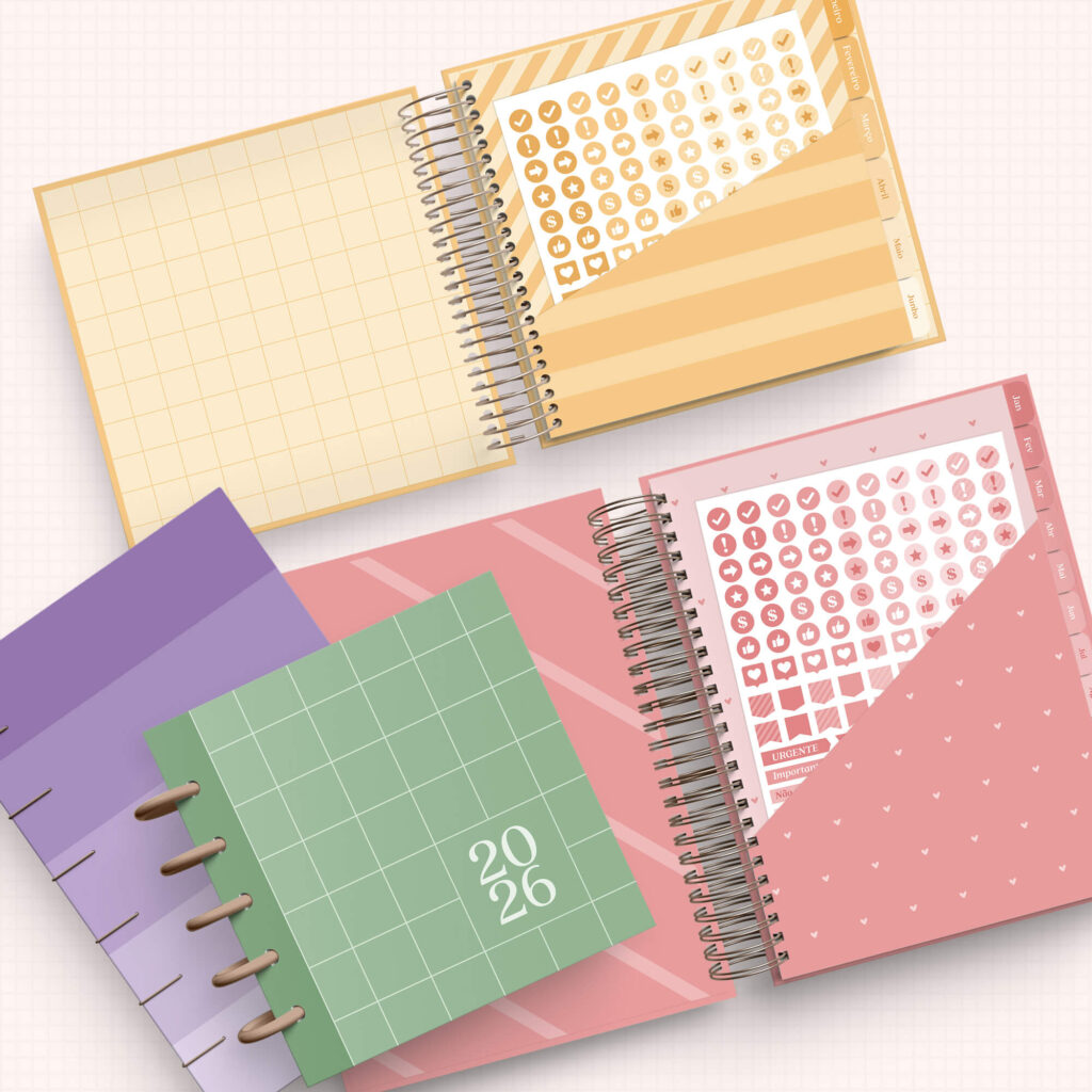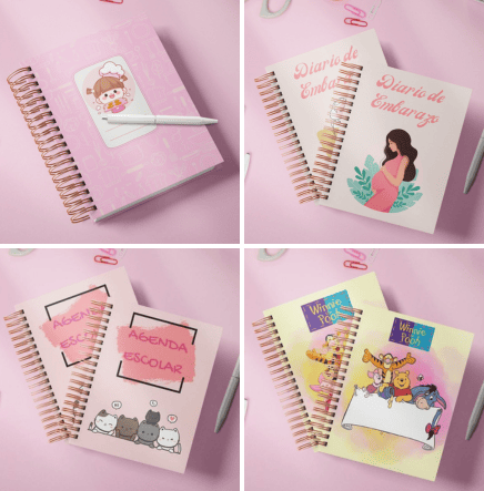 Recibirás un kit con archivos digitales con más de 100,000 archivos para encadernación, archivos completos que incluyen miolos, portadas, calendarios, agendas, planners, mockups y mucho más, ¡todo listo para imprimir y montar!